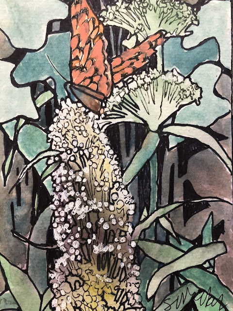 "Of course!" he said immediately, "That's a butterfly bush, and we have them right over here." So much for me thinking it was a Bavaria only bush! So now I am the proud owner and illustrator of my own very prolific and alive with butterflies bush!